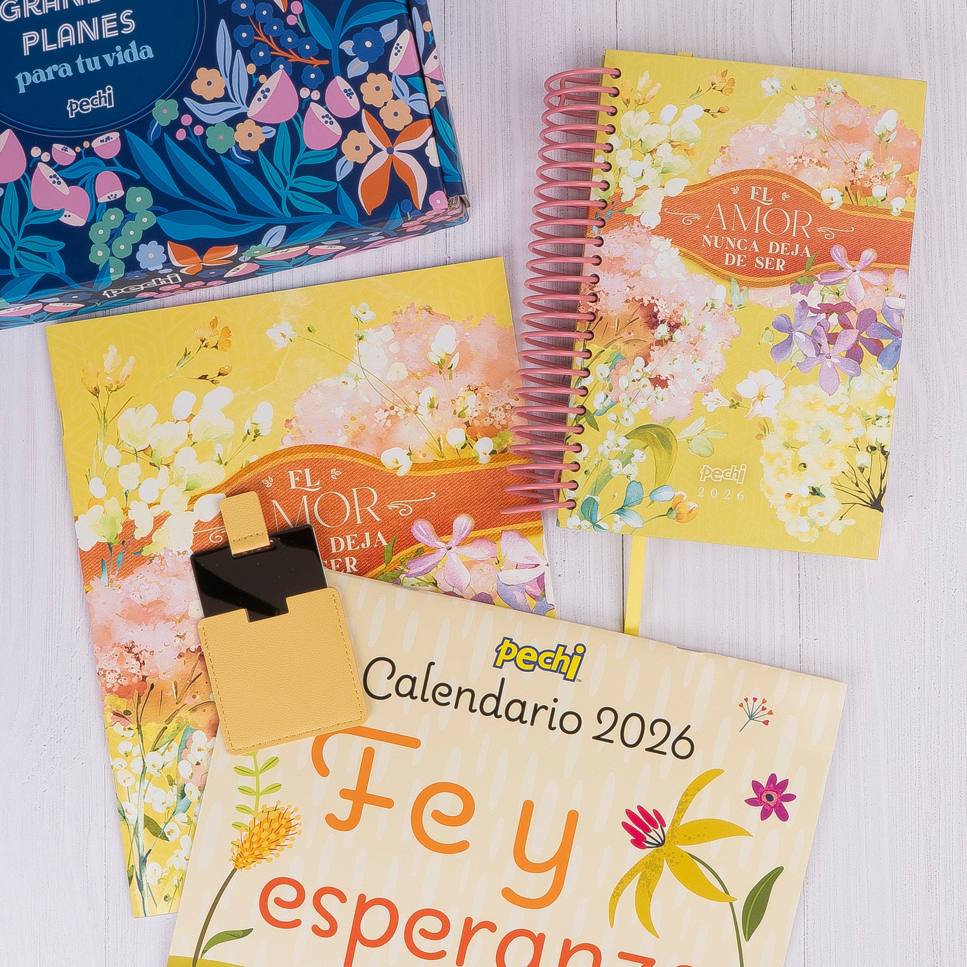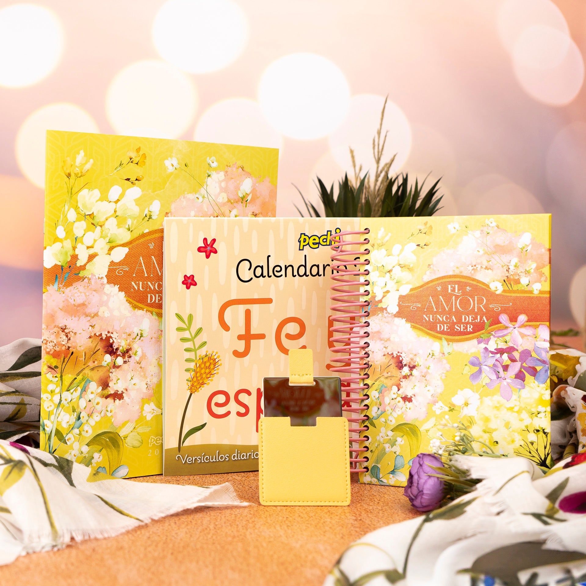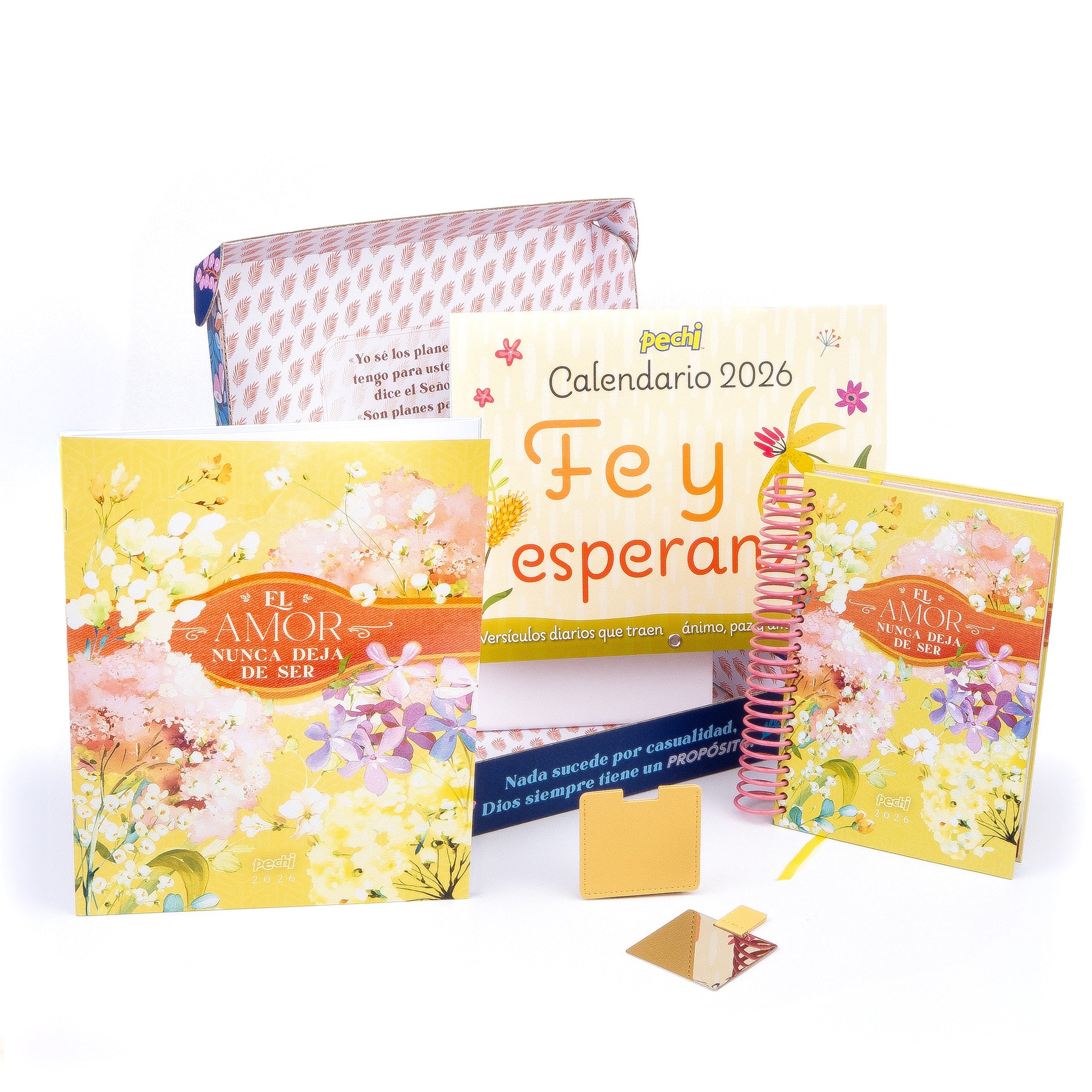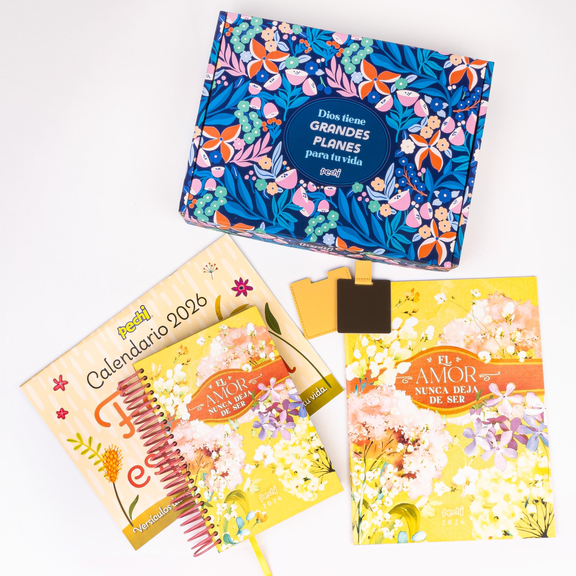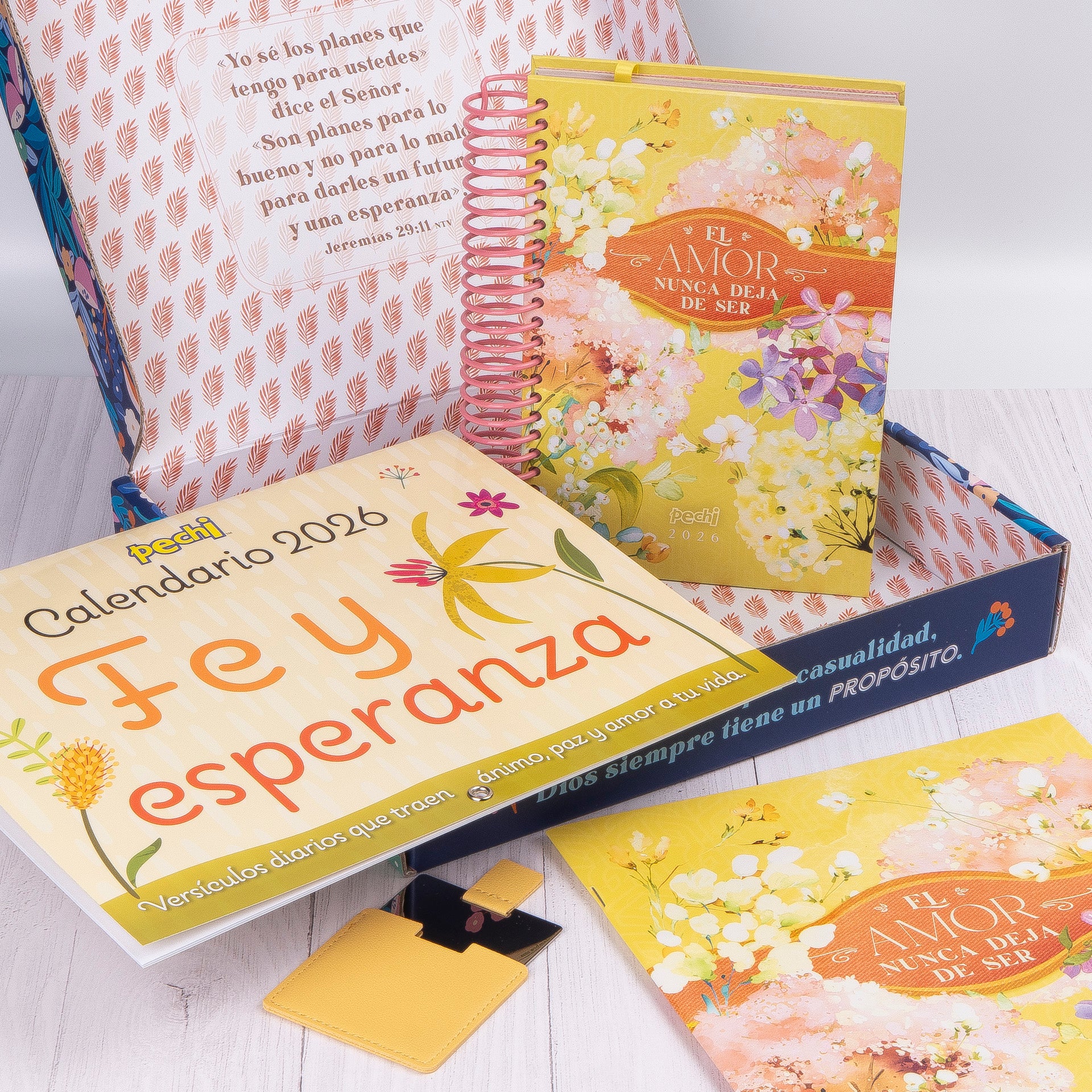 Nuestro hermoso kit de regalo incluye agenda espiral y planificador con el mismo diseño " El amor nunca deja de ser", calendario de pared con versículos diarios que traen ánimo, paz y guía a tu vida y un espejo de bolsillo con el logro grabado en la funda, todo dentro de una vibrante y hermosa caja, que puedes reutilizar para guardar esas cositas importantes que atesoras con mucho amor.