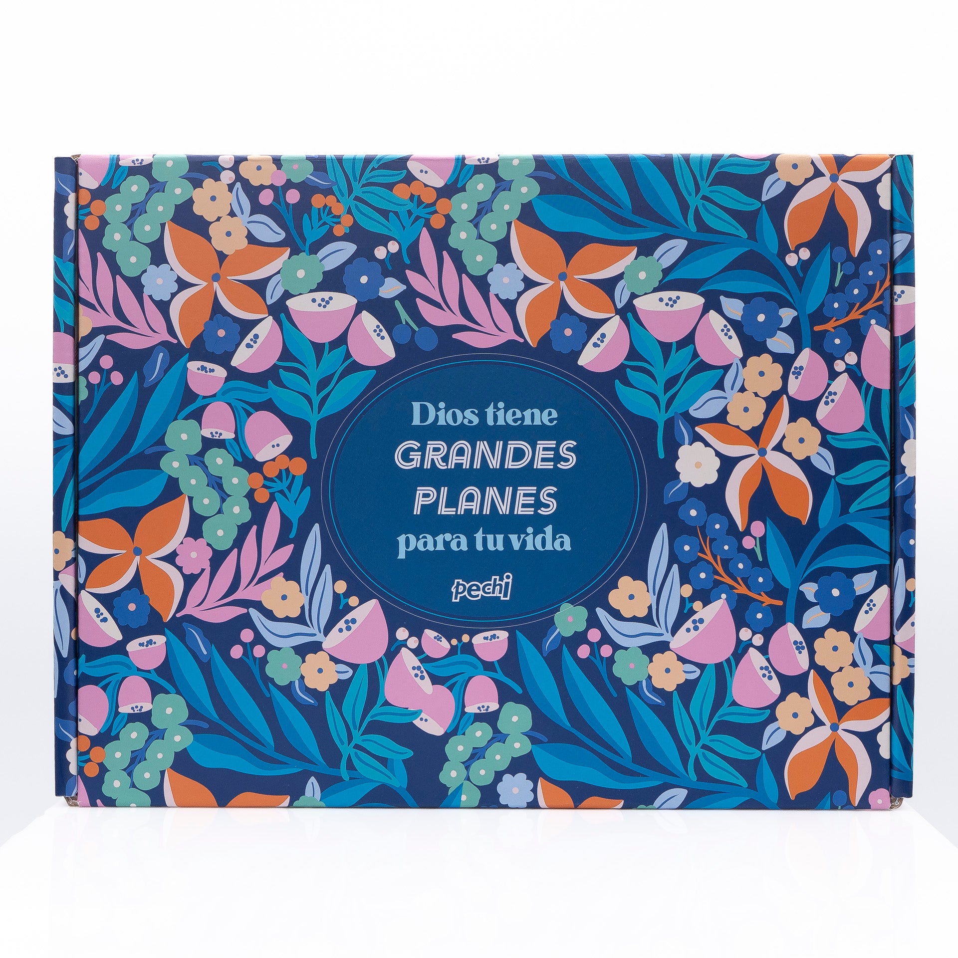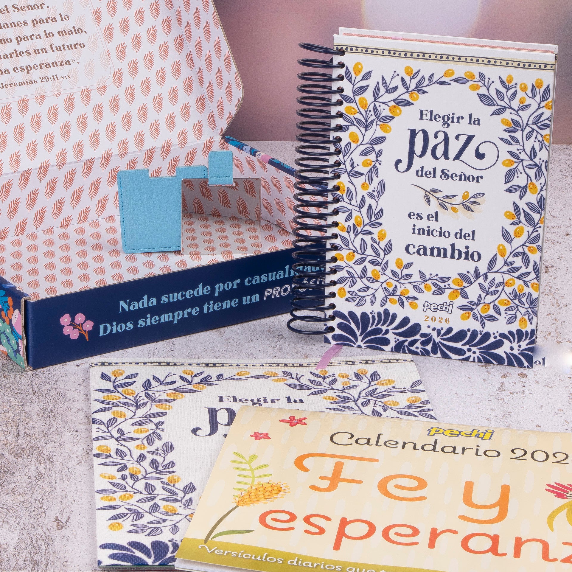 Nuestro hermoso kit de regalo incluye agenda espiral y planificador con el mismo diseño " Paz del Señor", calendario de pared con versículos diarios que traen ánimo, paz y guía a tu vida y un espejo de bolsillo con el logro grabado en la funda, todo dentro de una vibrante y hermosa caja, que puedes reutilizar para guardar esas cositas importantes que atesoras con mucho amor.