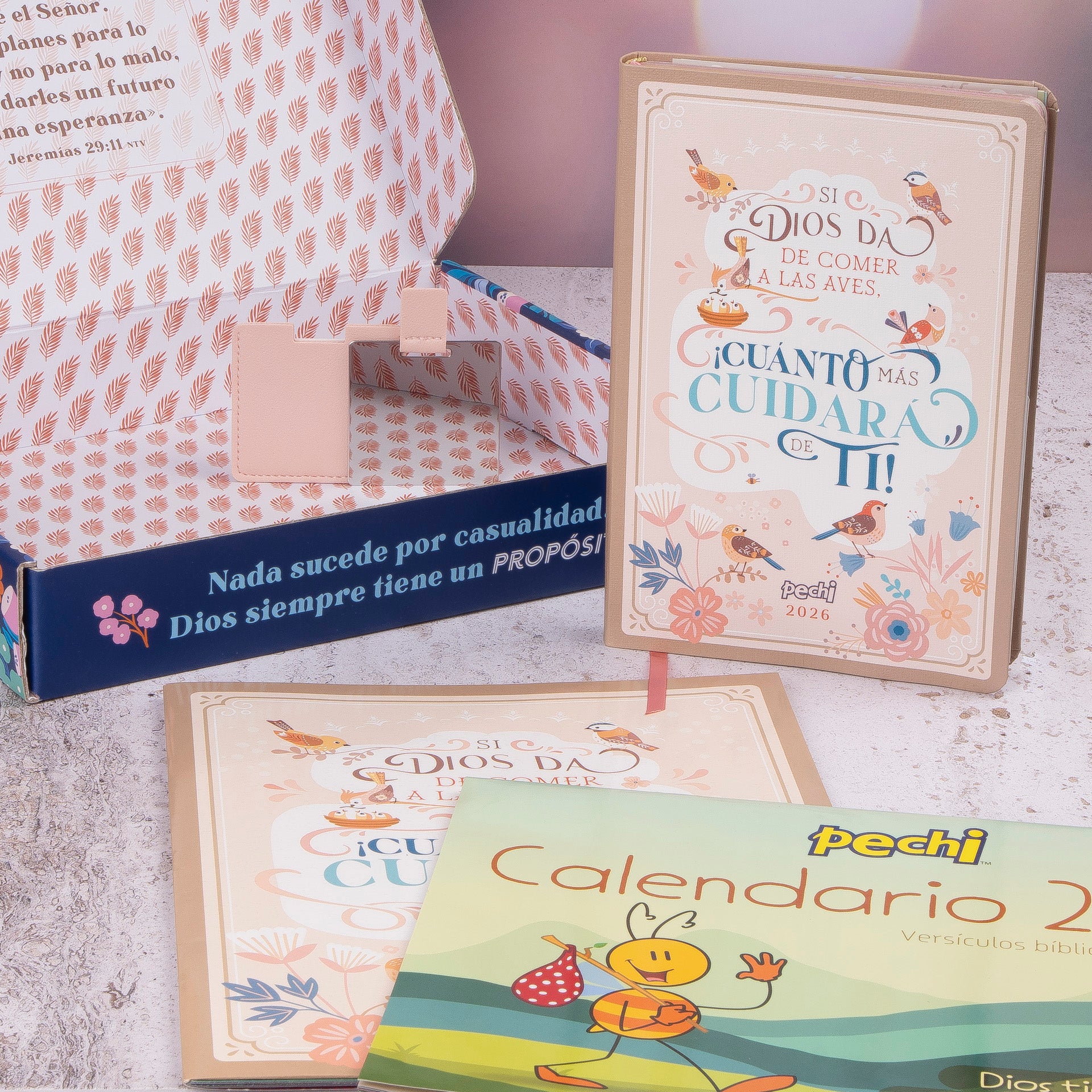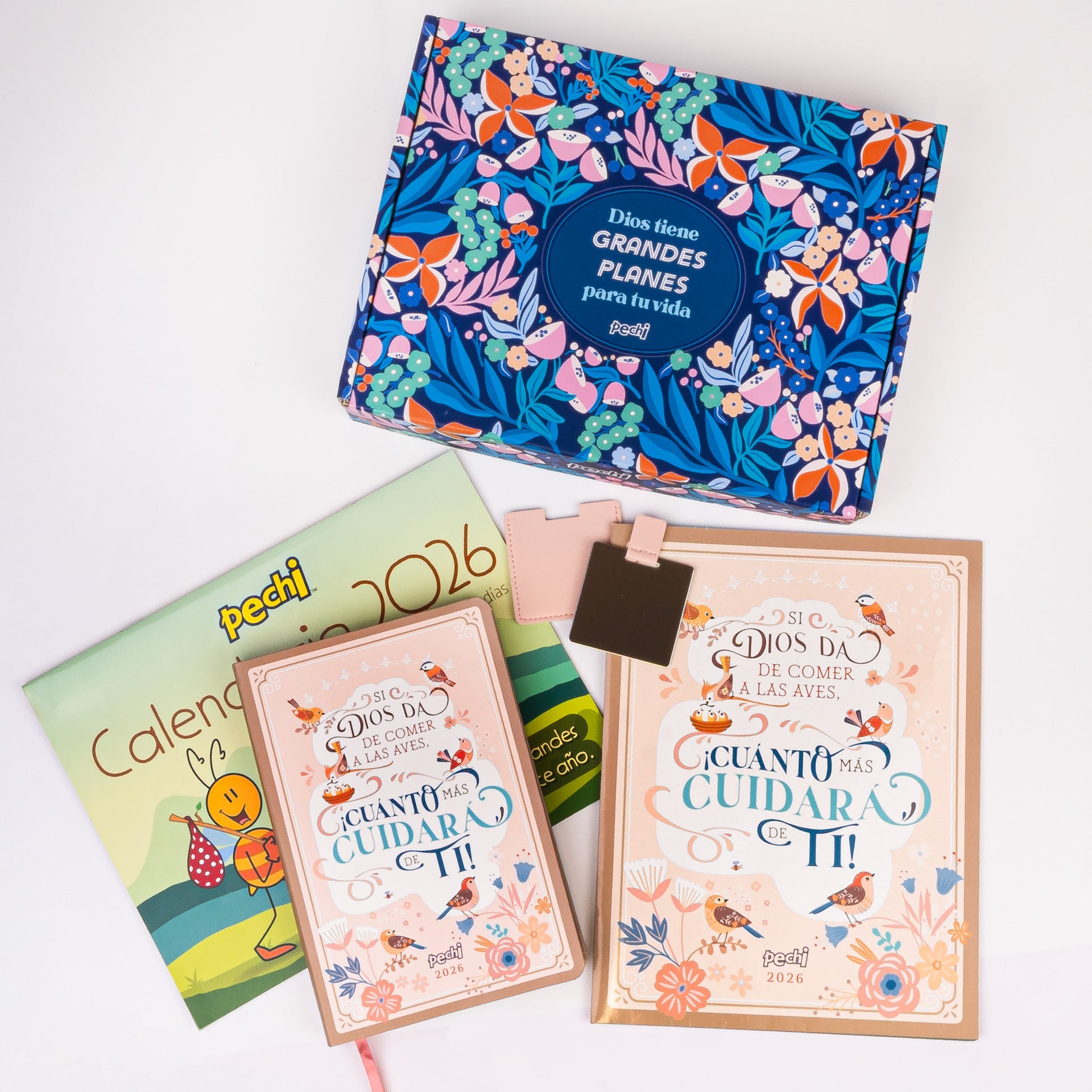 Nuestro hermoso kit de regalo incluye agenda y planificador con el mismo diseño " Si Dios da de comer a las aves, cuánto más cuidará de ti", calendario de pared colorido y divertidos personajes de Pechi y sus amigos y un espejo de bolsillo con el logro grabado en la funda, todo dentro de una vibrante y hermosa caja, que puedes reutilizar para guardar esas cositas importantes que atesoras con mucho amor.