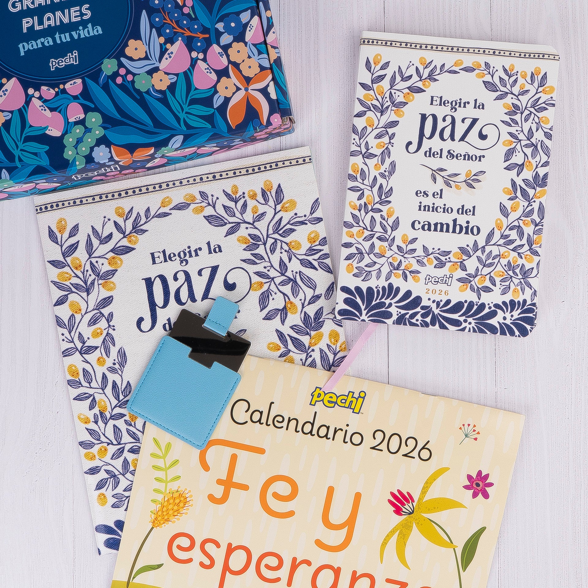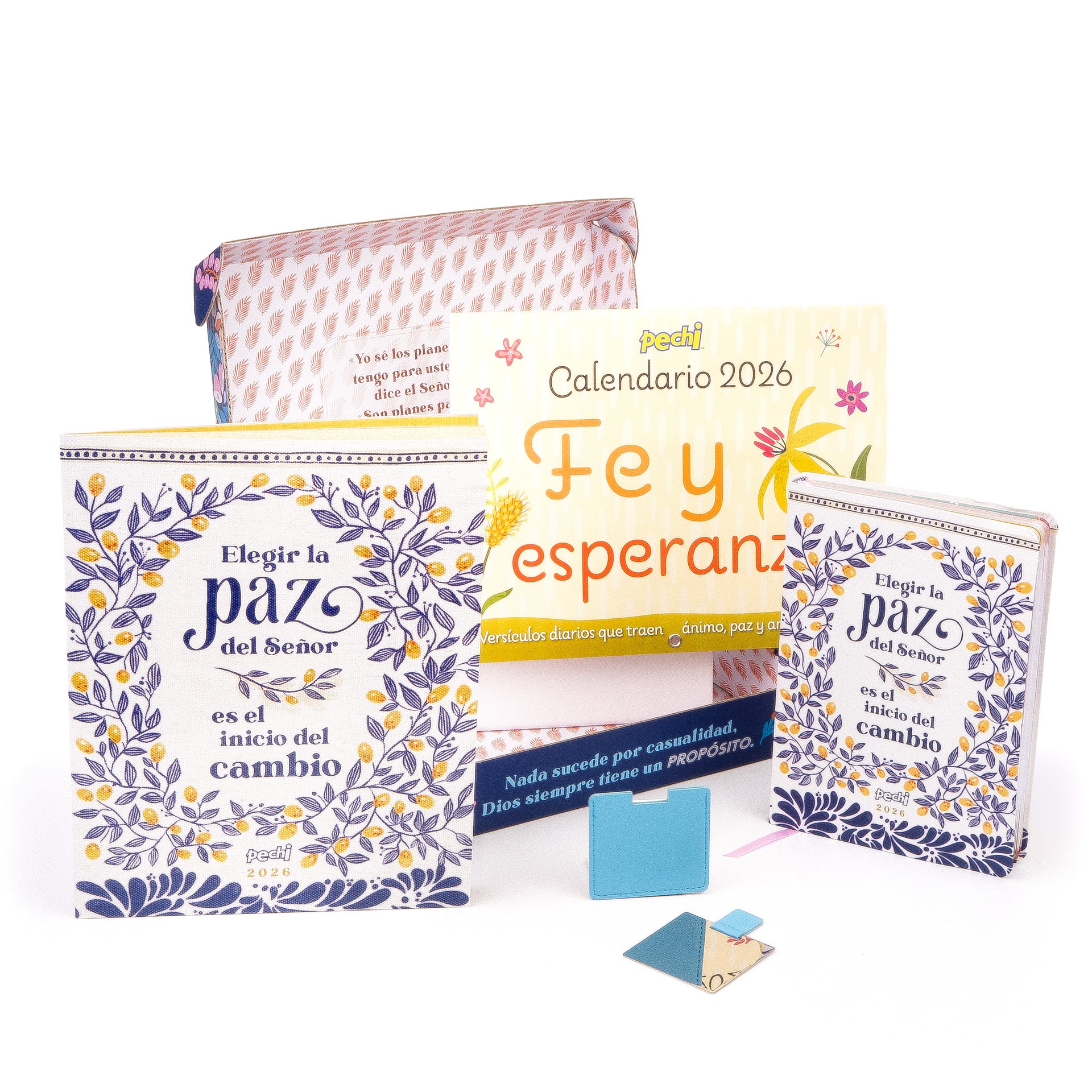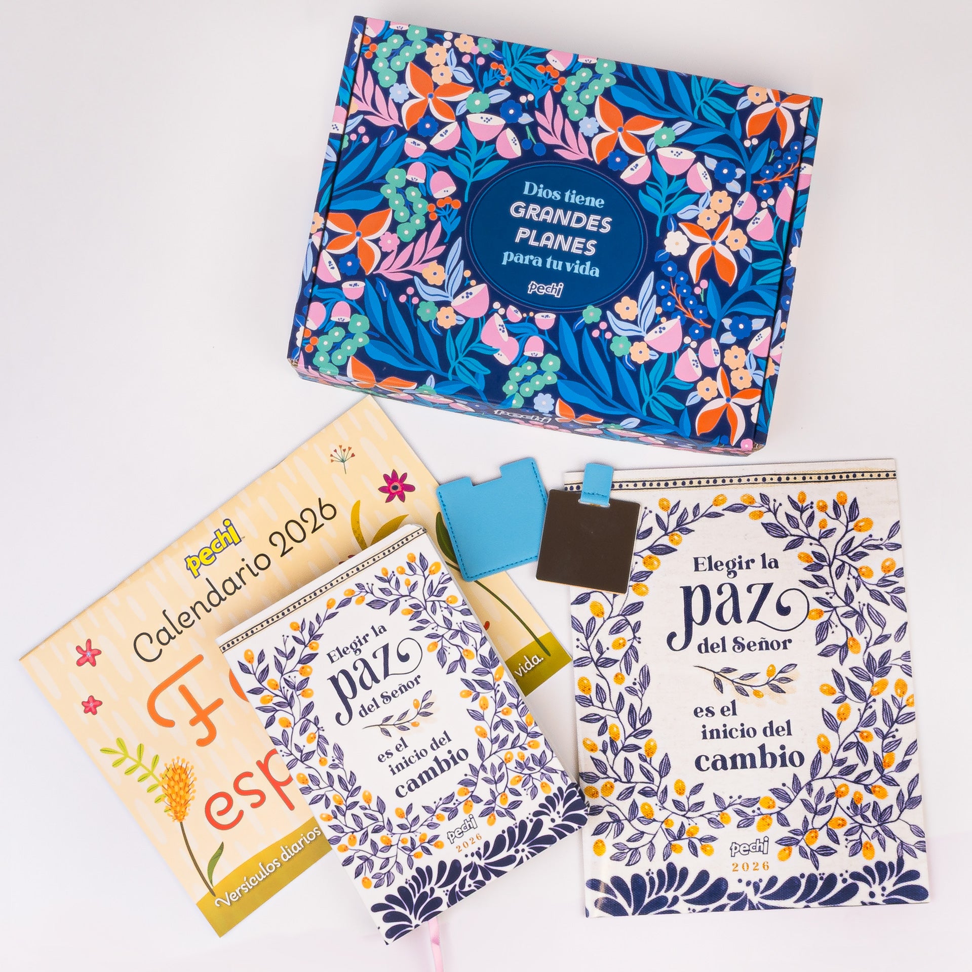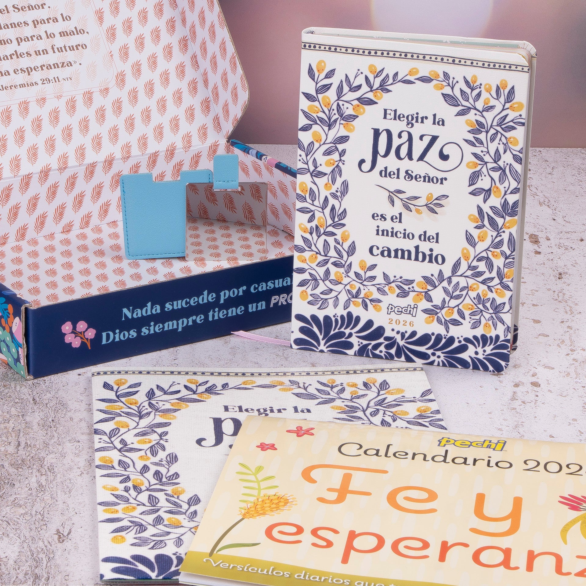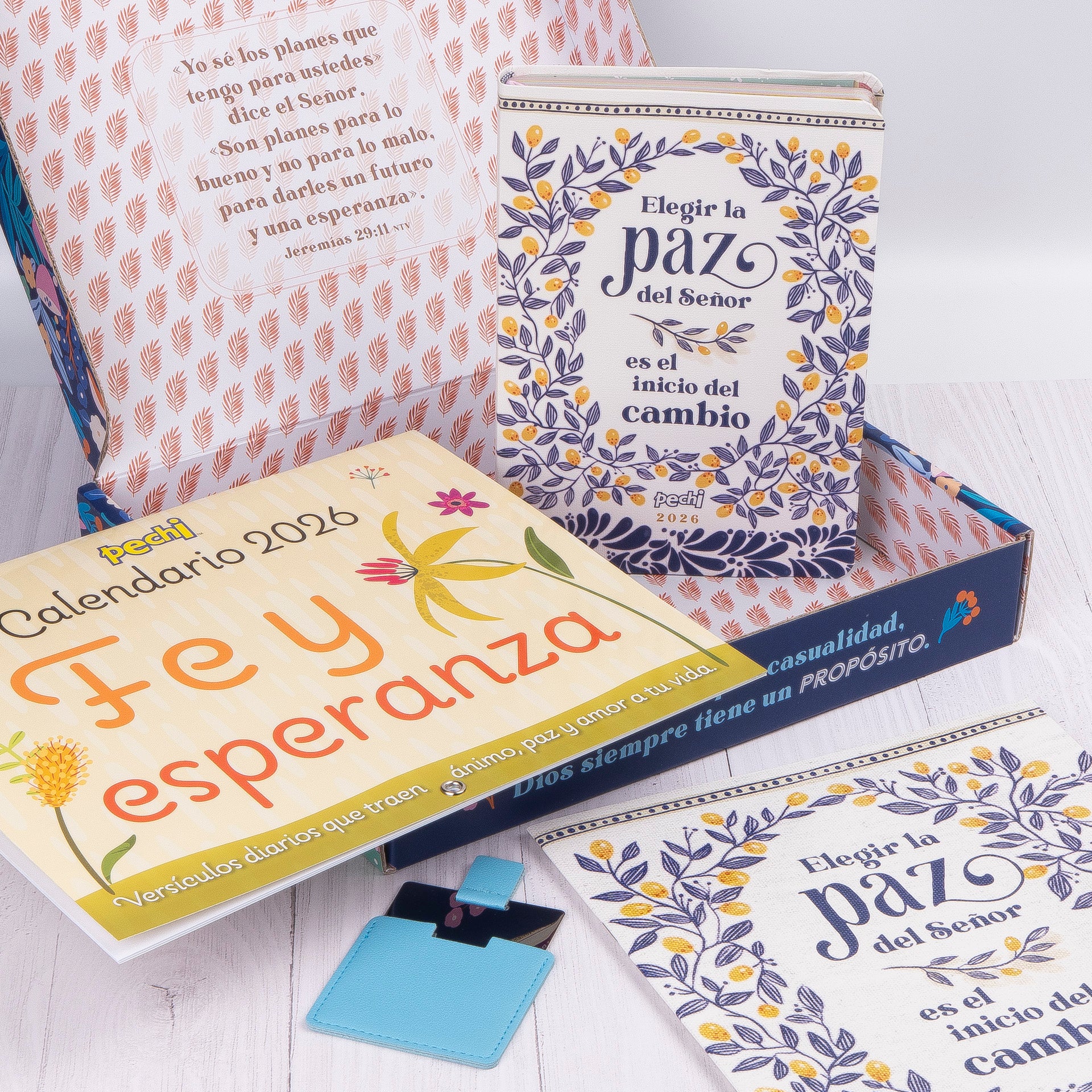 Nuestro hermoso kit de regalo incluye agenda flexi y planificador con el mismo diseño " Paz del Señor", calendario de pared con versículos diarios que traen ánimo, paz y guía a tu vida y un espejo de bolsillo con el logro grabado en la funda, todo dentro de una vibrante y hermosa caja, que puedes reutilizar para guardar esas cositas importantes que atesoras con mucho amor.