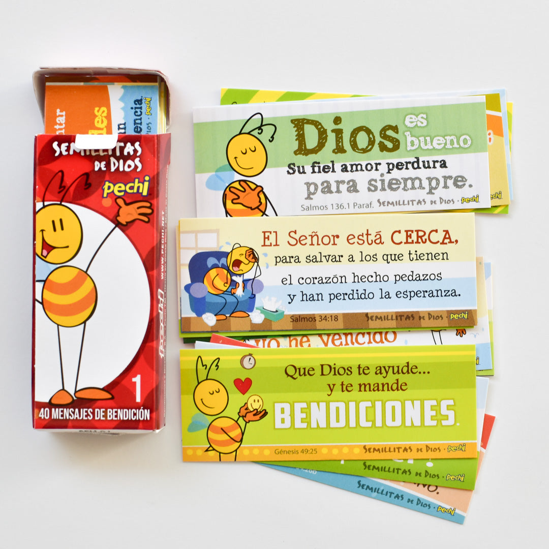 Cada cajita trae 40 tarjetitas diferentes, todos con versículos bíblicos hermosos, que cae como una semillita a nuestros corazones necesitados de esa palabra divina. Mide 8,2 cm de ancho por 3,1 cm de alto, viene empacado de bolsita con hueco para colgar.