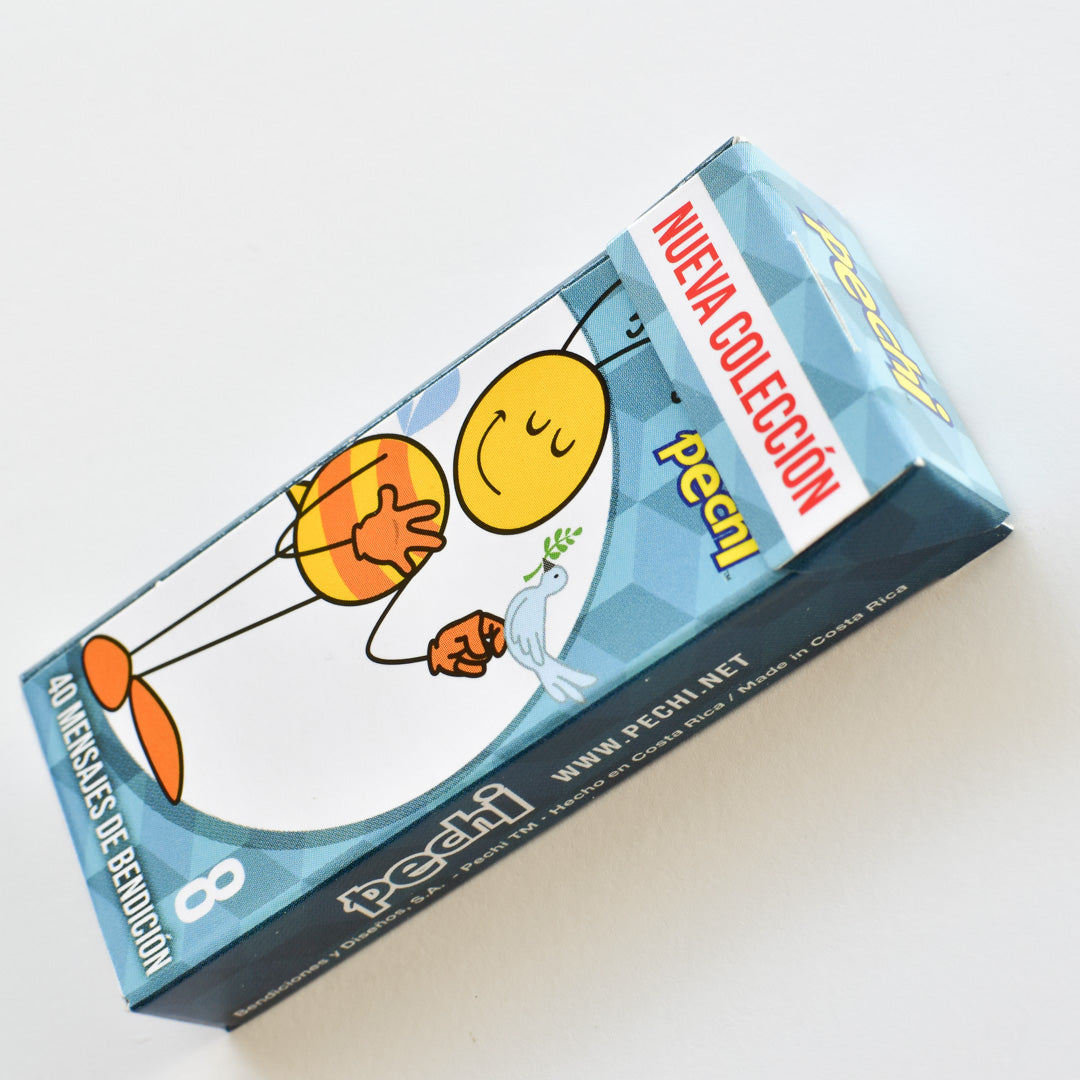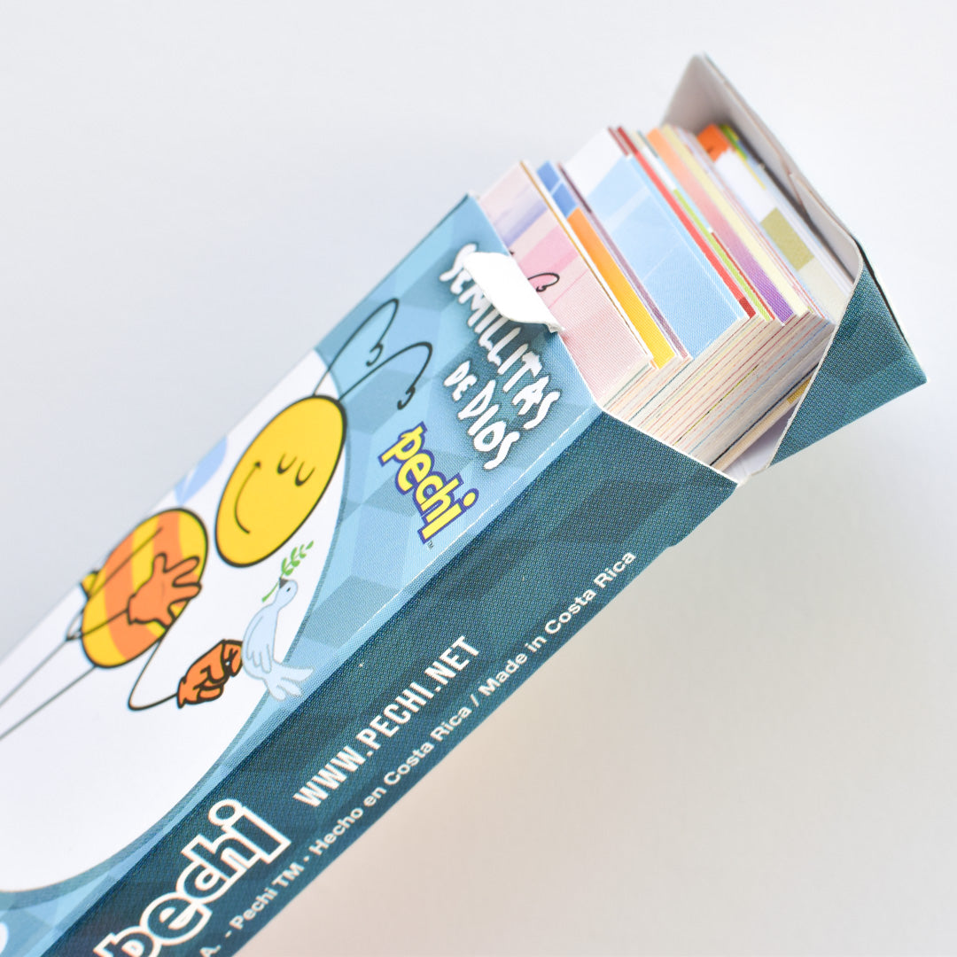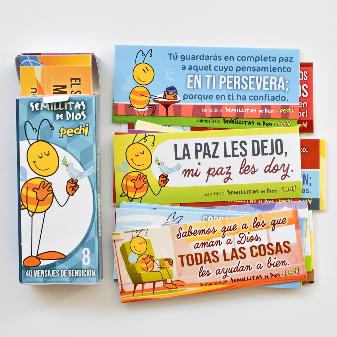 Cada cajita trae 40 tarjetitas diferentes, todos con versículos bíblicos hermosos, que cae como una semillita a nuestros corazones necesitados de esa palabra divina. Mide 8.2 cm de ancho por 3.1 cm de alto, viene empacado de bolsita con hueco para colgar.